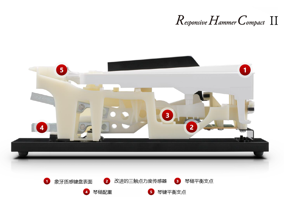 就像声学钢琴在低音区域使用更重的琴锤和在高音区域使用更轻的琴锤一样,紧凑型RH键盘也为琴锤分配了不同的重量,不同演奏键盘区域都有适当的配重分级。这些细节设计在演奏较强乐段时提供了更好的稳定性,同时保留了细腻的弱乐段控制。以满足敏锐的钢琴家的要求。