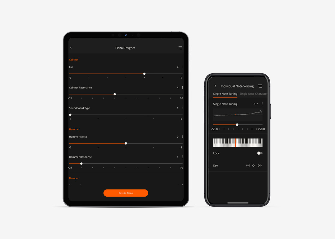 GP-9 内置多组专业级三角钢琴音色,可随时调用。如果您是经验丰富的演奏家,可以在内置的 Piano Designer 工具中进行深度编辑,进一步完善音色和响应,以满足您的个人需求。譬如调整琴弦的音高和音律,微调键盘的灵敏度和双重共鸣音阶,调节琴体共振等等。