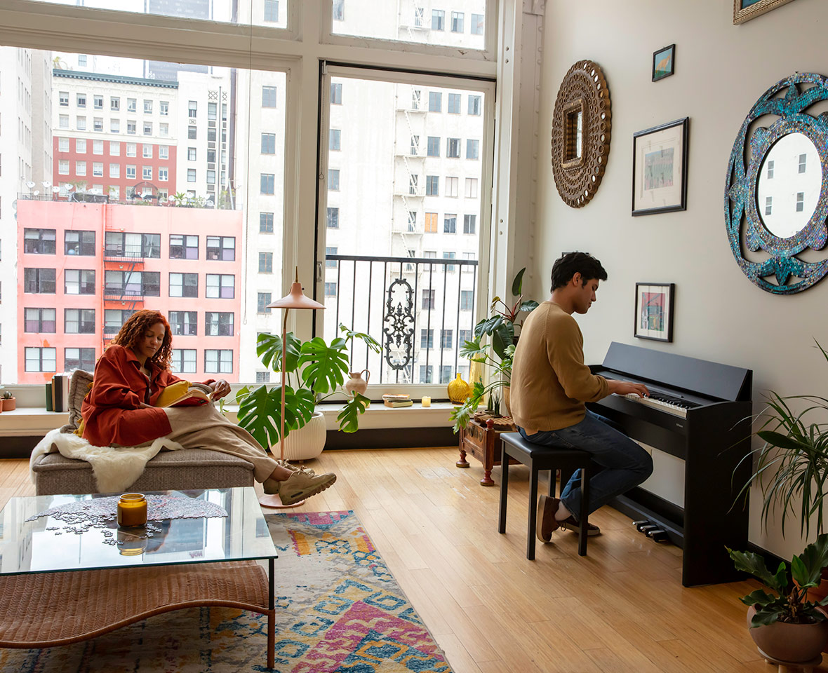 Roland 家用钢琴系列产品因外观设计广受好评,F107 电钢琴也不例外,简约的琴身参考了 2021 红点设计大奖得奖作品 F701 电钢琴,摆放在各种生活空间都是一件赏心悦目的单品。体积小巧的 F107 电钢琴并不会占据过多空间,还配备了优雅琴盖,不弹奏时可以关上保护键盘,准备弹奏时又可以打开当作支架放置乐谱和移动设备,F107 巧妙有序的操作界面可以确保演奏者迅速找到需要的功能,无需分心。