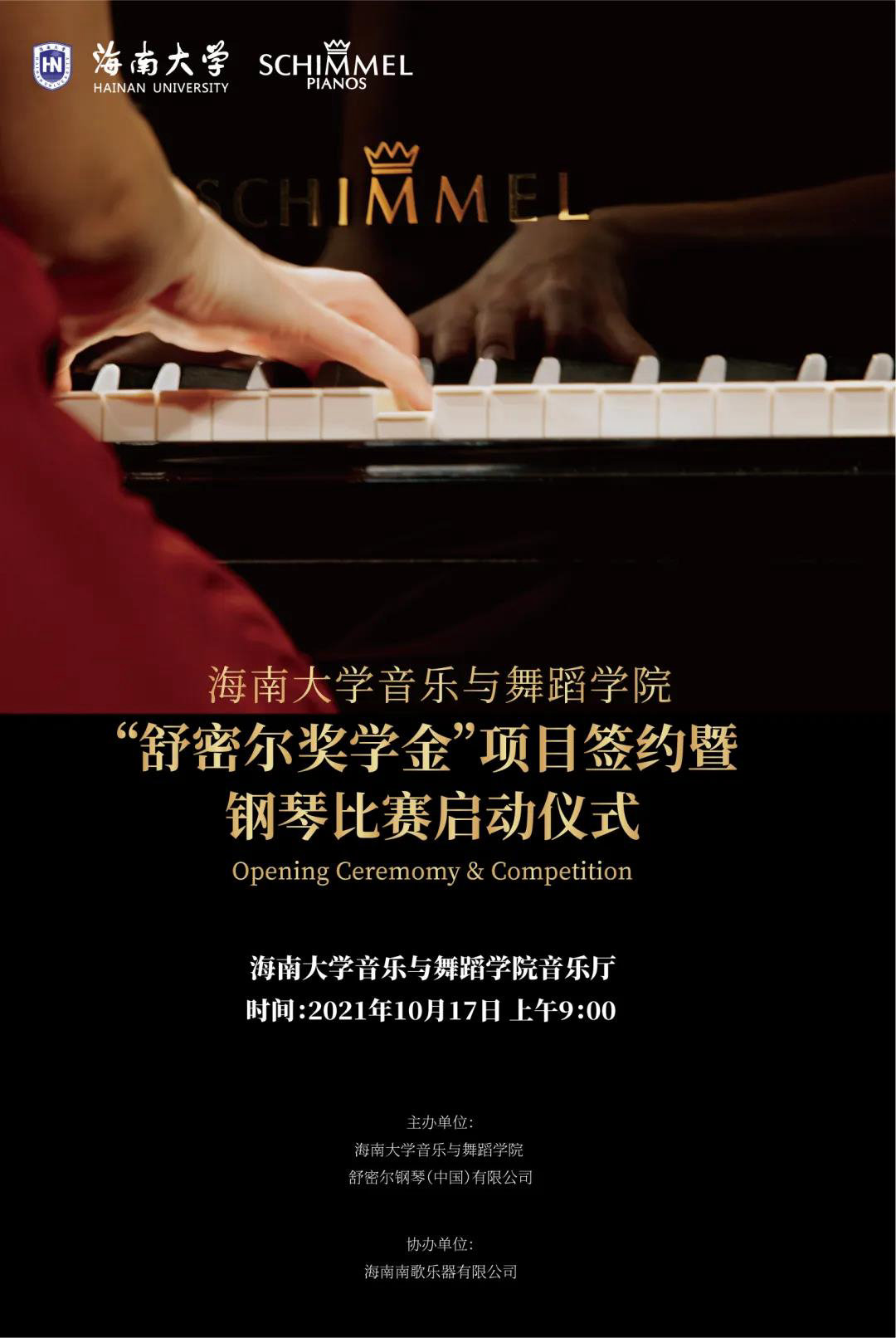海南大学“舒密尔奖学金”项目签约暨钢琴比赛启动仪式将于2021年10月17日在海南大学音乐与舞蹈学院音乐厅举行。
