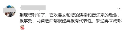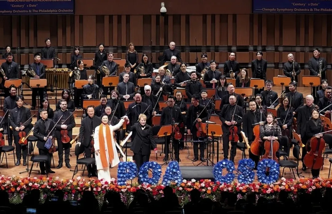 而在正式演出结束后的 encore(返场) 环节,费城交响乐团带来了一个意外之喜。他们演奏了一曲《成都》,熟悉的旋律瞬间点燃了全场观众的热情。本就因这场音乐盛宴而沉浸在美妙氛围中的人们,此刻更是被这充满地域特色与温情的乐章深深触动。乐手们用灵动的音符描绘出成都的大街小巷、烟火人间,让这座城市的独特魅力在音乐中流淌,为这场音乐会画上了一个别具意义且令人难忘的句号,也让成都与费城之间因音乐而缔结的情谊更加深厚而独特。
